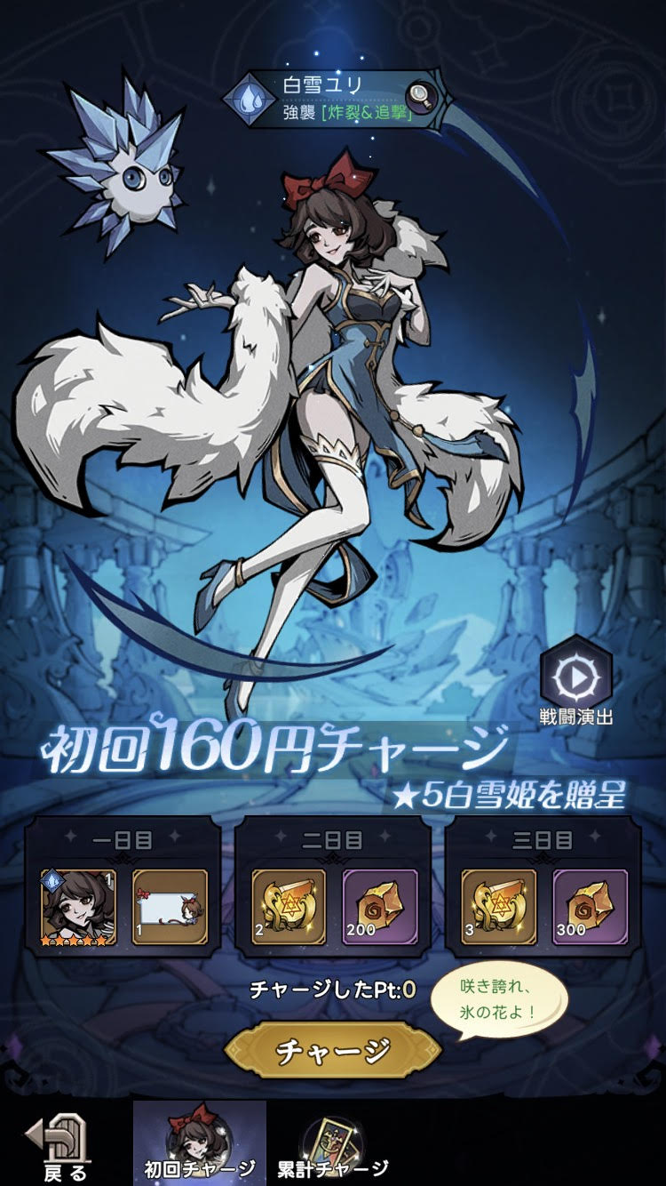 このチャージでは、強力な☆5キャラである「白雪ユリ」をゲット出来る他、各種アイテムも手に入るのでとてもお得な内容になっています♪